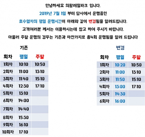 2019년 7월1일 월요일 부터 당사에서 운행중인 호수열차의 평일 운영시간이